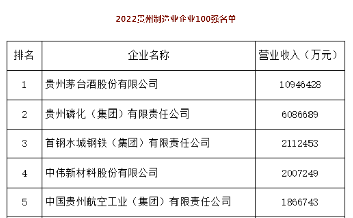 據了解,本次“2022貴州制造業企業100強”名單由貴州省企業聯合會、貴州省企業家協會參照中國企聯中國企業500強排序發布規則和國際通行慣例,在企業自愿申報的基礎上,以2021年企業營業收入為主要入圍標準并自然排序,經組織專家團隊分析,最終排出。